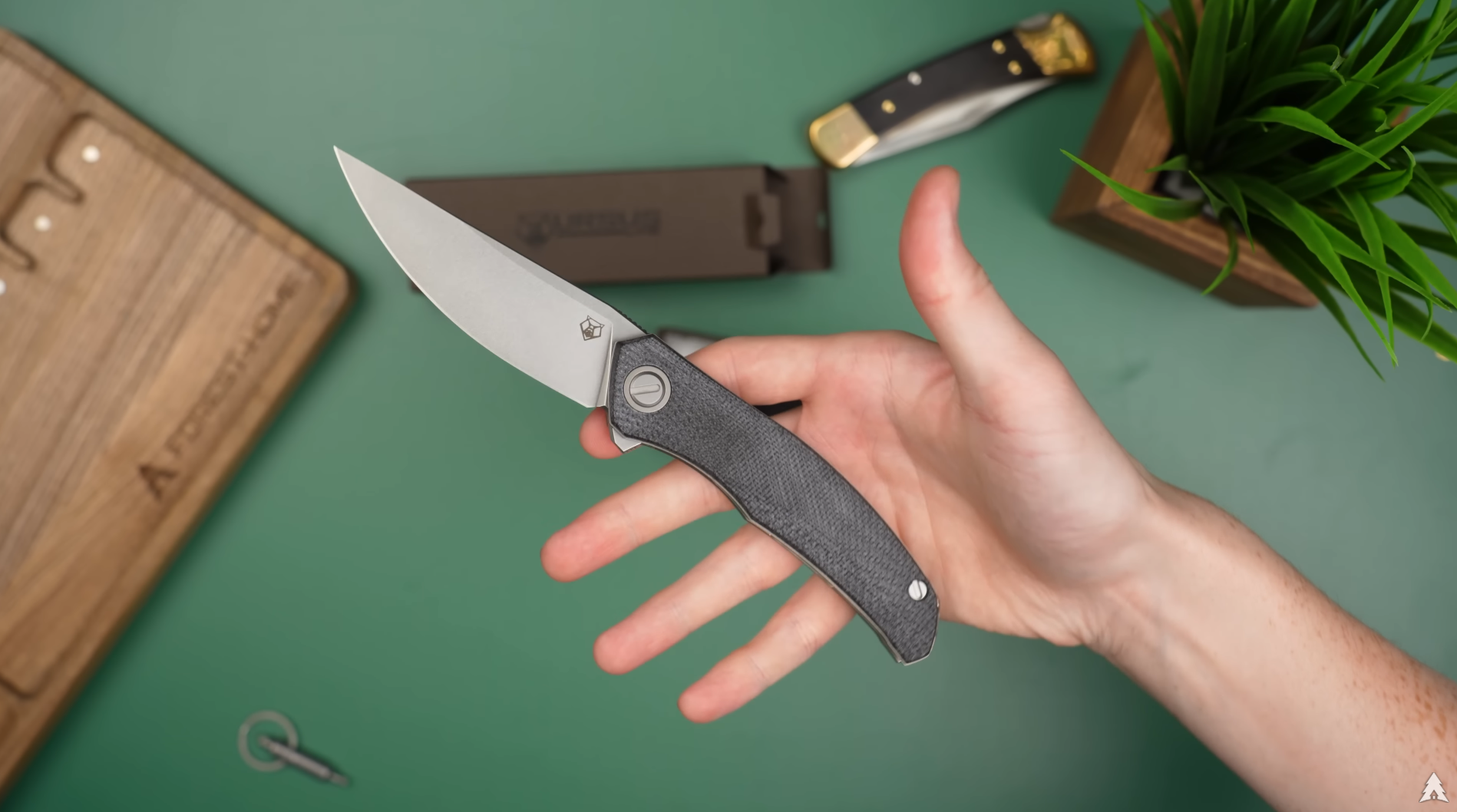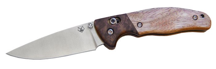 Лайнеры выполнены из титана — с множеством выборок и фрезеровок, благодаря чему нож остаётся прочным, но лёгким. Вес модели составляет 135 граммов при общей длине 224 мм и длине клинка 95 мм — отличный баланс для повседневного ношения и работы.