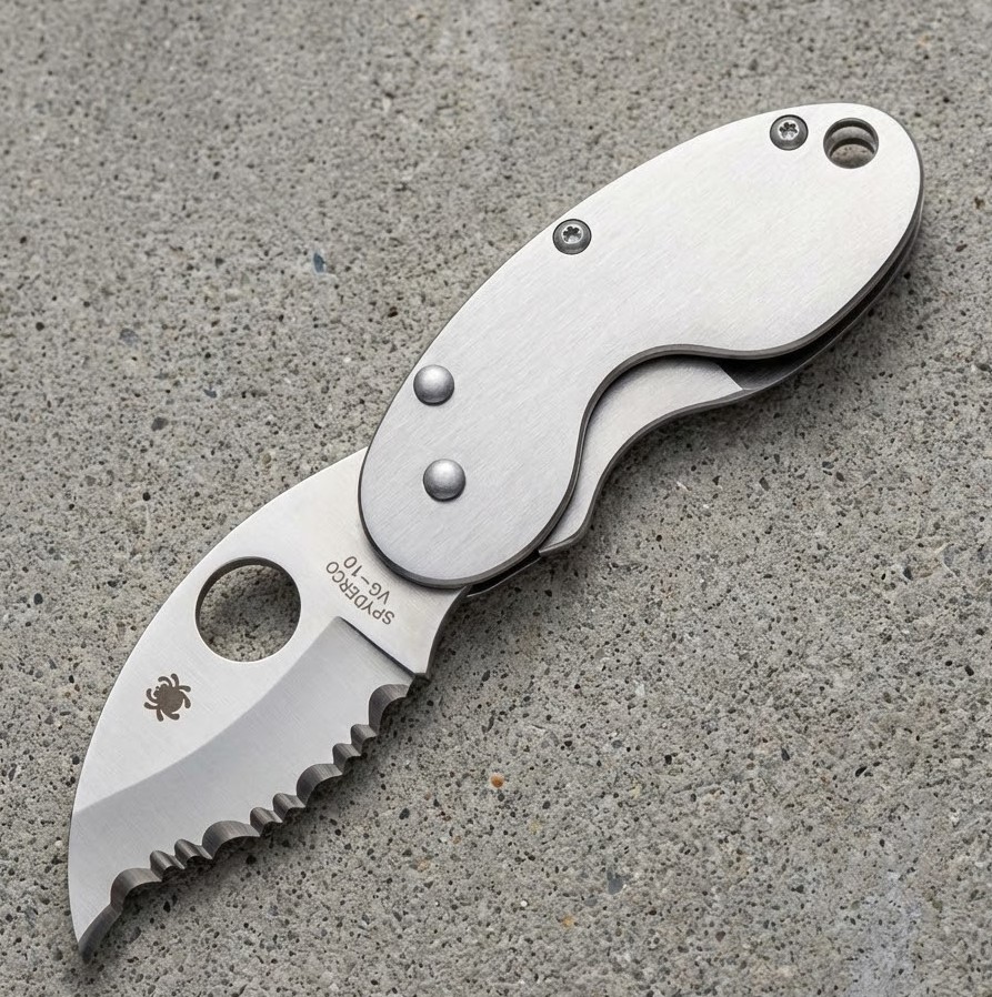 Клинок выполнен из японской стали VG-10, которая хорошо держит заточку и устойчива к коррозии. Рукоять — стальная, что типично для японских моделей Spyderco, но стоит учитывать, что она довольно быстро покрывается царапинами.