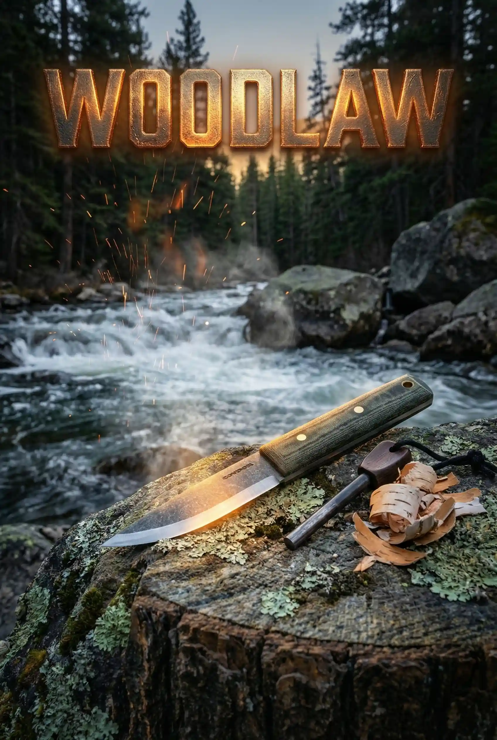 Woodlaw Survival Knife создавался как универсальный инструмент выживания: полный хвостовик из 1075, плоские спуски, микарта и кожаные ножны.