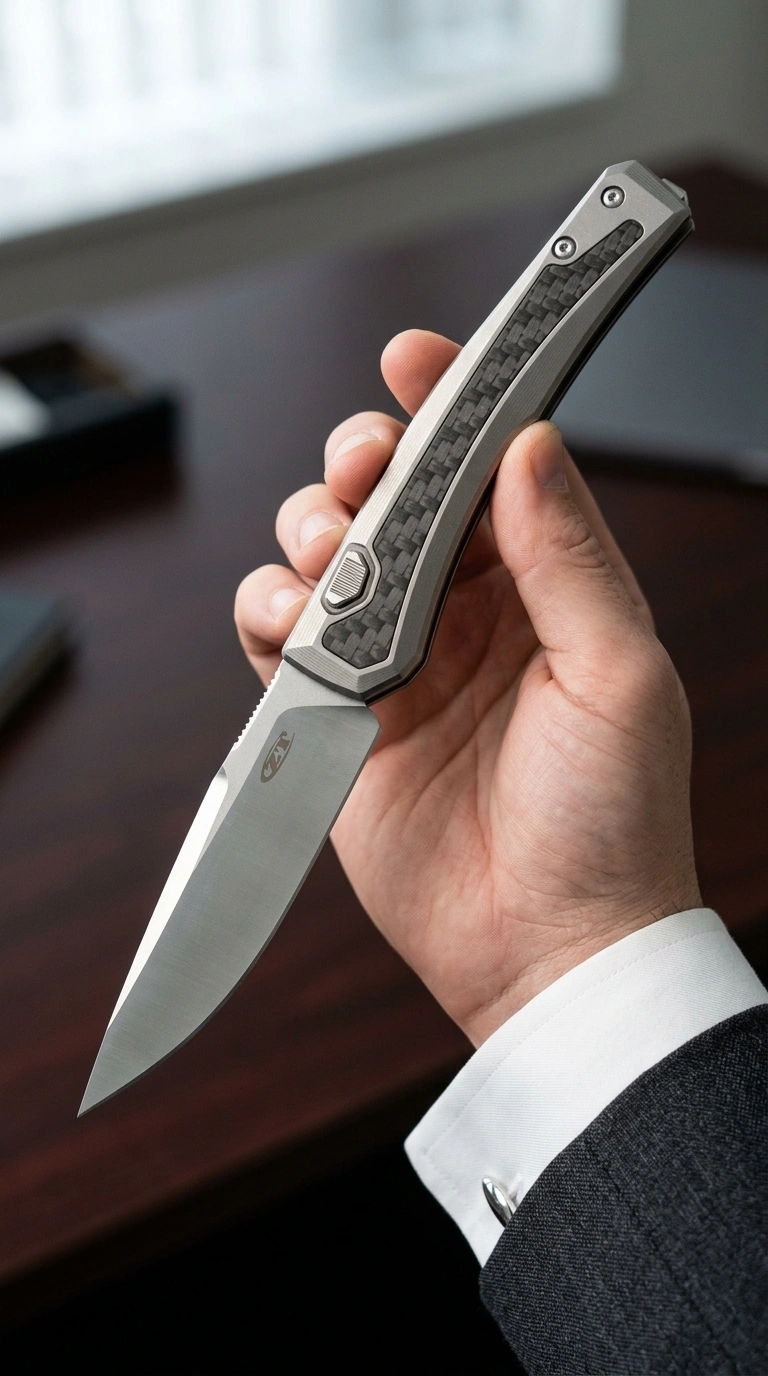 ZT 0556 — это нож, которому хочется соответствовать. Тонкий профиль, карбон с титаном — выглядит дороже прайса. Форма клинка классическая, но это не упрёк: проверенная геометрия просто работает, и незачем изобретать колесо.
