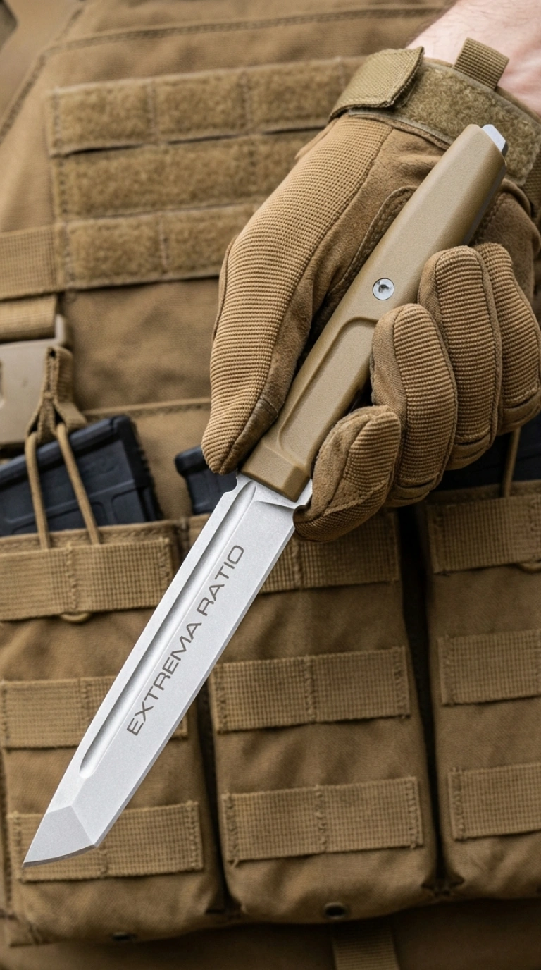 Mamba — это не про красоту, это про харизму уродства, которая притягивает. Extrema Ratio делает ножи для спецподразделений, и это чувствуется. Рукоять узкая, хищная, рассчитанная на быстрый хват, а ножны с системой быстрого сброса позволяют выхватить нож за долю секунды.