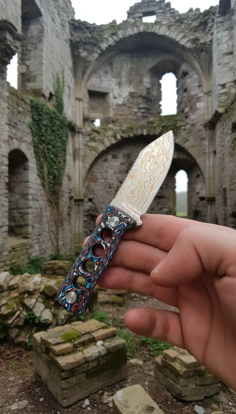 QSP Canary — это шейный нож, который хочется показывать. Клинок из дамаска с медью и латунью ловит взгляды, рисунок всегда уникальный. Трёхцветная перфорированная рукоять из карбона — дорого, эффектно, приятно в руке. Обух 3 мм, длина клинка 6,3 см: удобно как для вскрытия посылок, так и для точной работы на природе или дома. Весит всего 83 г, не мешает на шее. В комплекте кайдекс и цепочка — носи, не задумываясь. Инструмент и стильный аксессуар в одном.