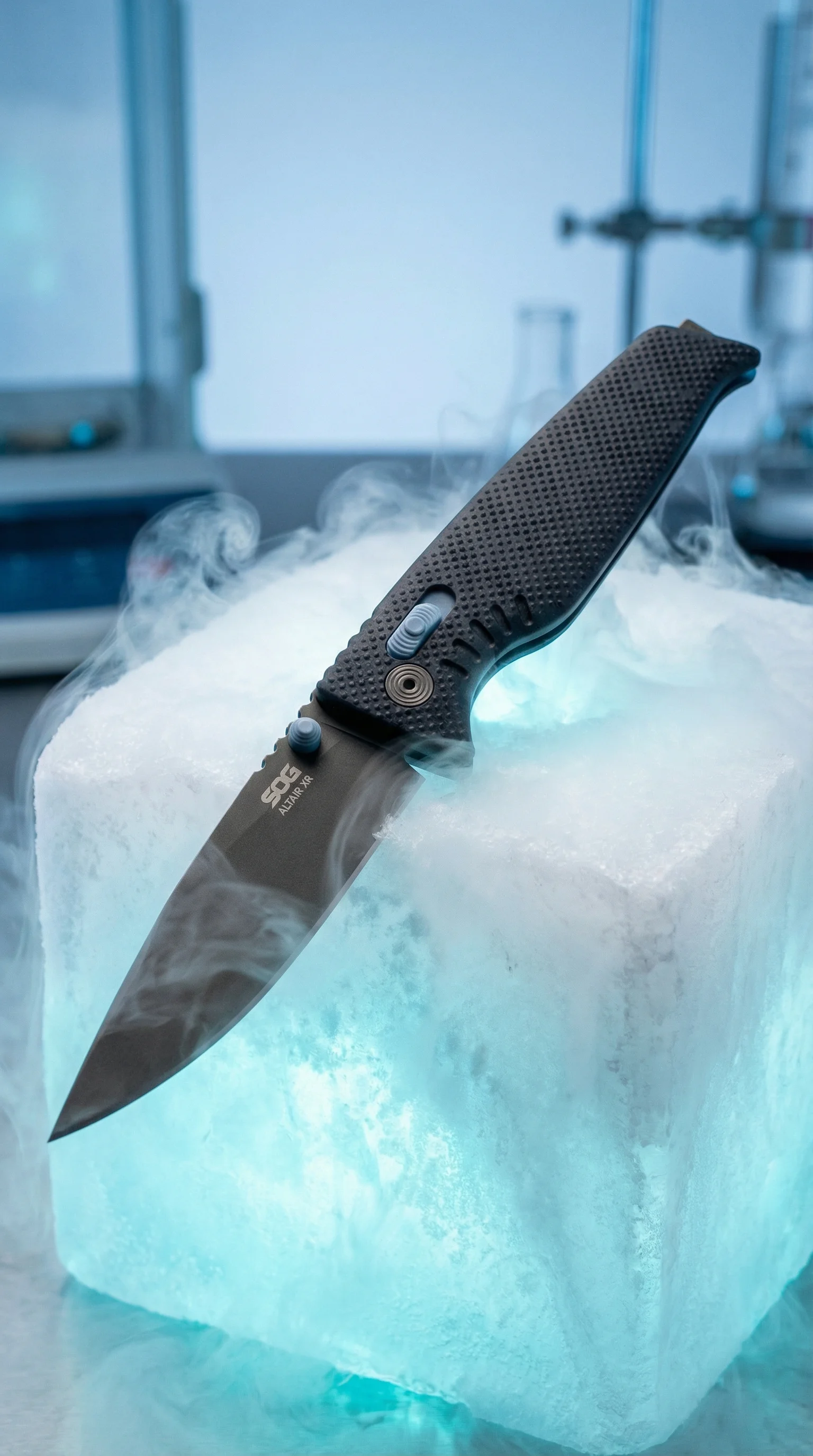 SOG Altair XR - это уже другой уровень. Обух тонкий, сталь Cryo 154CM (с криообработкой), рукоять из синего GRN. Но главное - замок XR Lock, это их лучшая версия аксисоподобного замка. Движется не по прямой, а по дуге, плюс установлен на качельке с осью. Получается мягко, цепко и очень комфортно. Флажок крупный, шершавый - открывать удобно даже в перчатках.