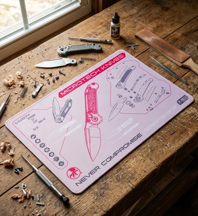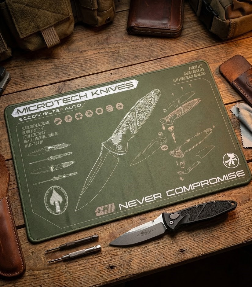 Оригинальные коврики от этого бренда отлично украсят как рабочий стол, так и полку с коллекцией ножей. Прикольные коврики с подробной информацией о ножах. На светлом у нас LUDT, а на тёмно-зелёном — Socom Elite Auto. Ножи показаны в разборе и очень подробно, так что можно изучить их устройство без разборки, ну или воспользоваться им как шпаргалкой, если разобрали один из этих ножей.