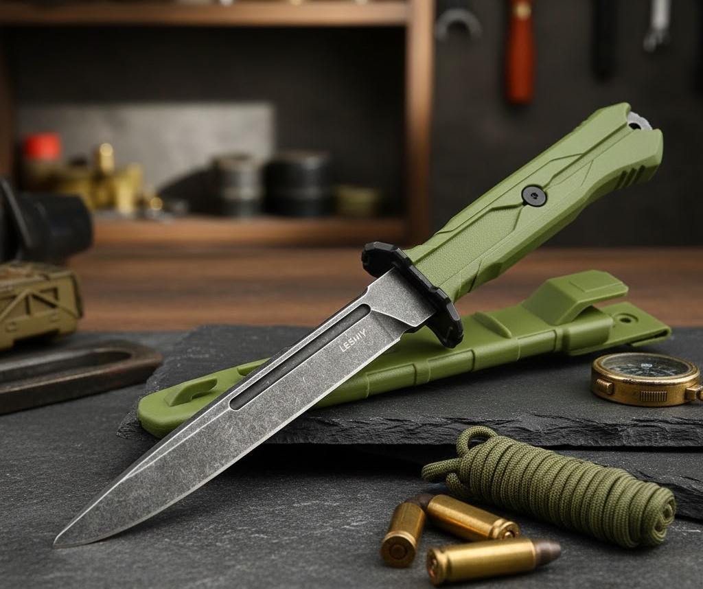 Да, нож будет уже не таким утилитарным и удобным в использовании, зато обладает более агрессивными формами. По своему виду похож на холодное оружие, однако таковым не является и доступен к покупке и владению без всяких лицензий. Всё за счёт скошенного острия, которое выводит его из ХО. Материалы простые, но для такого ножа вполне уместные: клинок выполнен из нержавейки AUS-8, а рукоять — из эластрона. Ножны пластиковые, достаточно узкие, так что при ношении будут удобными. Фиксация ножа в ножнах тоже хорошая, и отдельно стоит отметить, что ножны симметричные, так что не нужно думать и смотреть, какой стороной убирать нож.