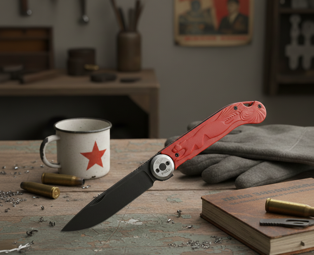 В дизайне узнаются формы классической «Белки», той самой, которая была у многих мальчишек в СССР. Но от «Белки» здесь только схожие черты, ну и рельеф в виде белки на накладке. Хоть на клинке и есть ногтевой зацеп, открывается нож очень легко с помощью флиппера, механика бодрая — за счёт подшипников в осевом узле. Клинок выполнен из стали 8Cr14MoV, а накладки — из FRN-пластика.