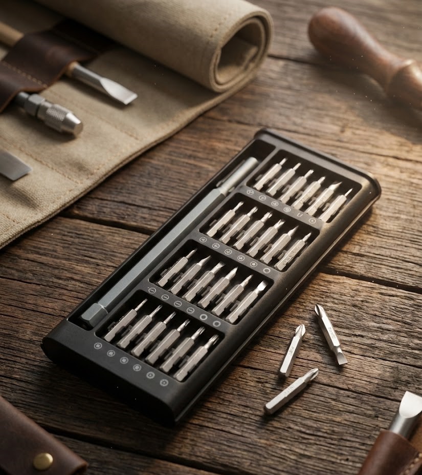 Штуковина очень компактная и универсальная. Прекрасно подойдёт для работы с электроникой, гаджетами, мелкой техникой, ну и, конечно же, с ножами. В наборе здесь 24 сменные биты и удобная отвёртка с магнитным битодержателем. Весь этот набор очень аккуратно располагается в пластиковом чехле, так что можно даже брать его с собой.