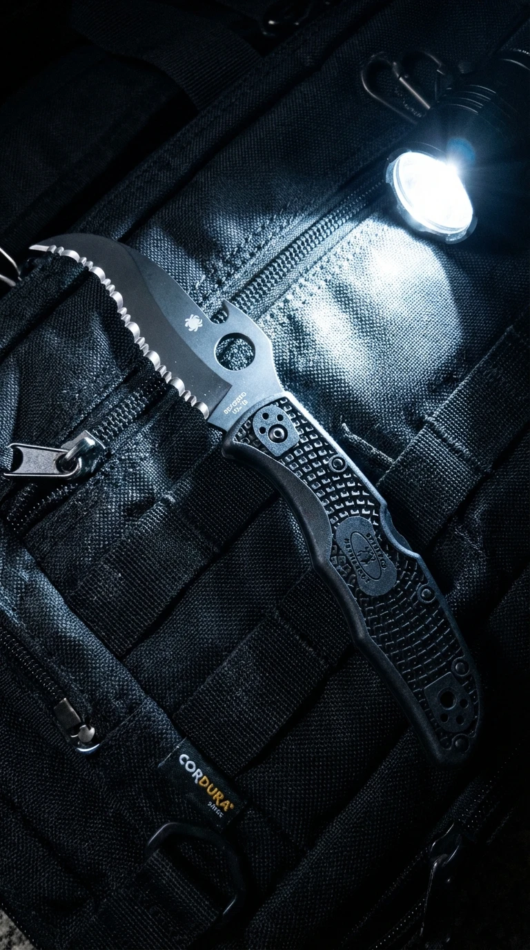 Серрейтор здесь — инструмент, а не украшение. Стропы, синтетика, ремни — режет быстро и безопасно. VG-10 на клинке, FRN на рукояти, четырёхпозиционная клипса — всё как у взрослого Spyderco. Замок Compression Lock держит без вопросов.