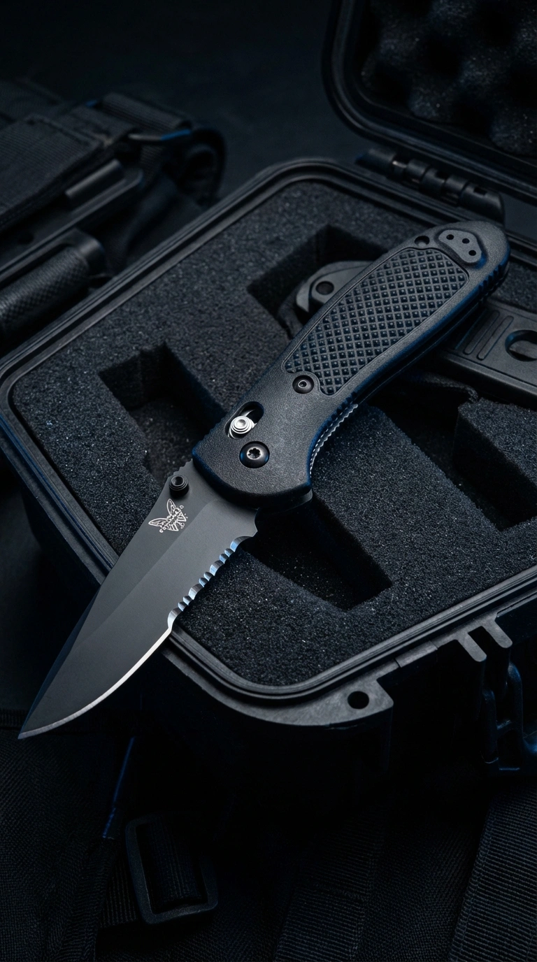 Griptilian 551 в чёрной серрейторной версии — это тот самый случай, когда «тактический» не равно «бесполезный». Чёрный клинок, чёрная рукоять, полусеррейтор — выглядит серьёзно, работает серьёзно. Axis Lock здесь на месте: один из самых надёжных замков в индустрии, работает одной рукой в любых перчатках.