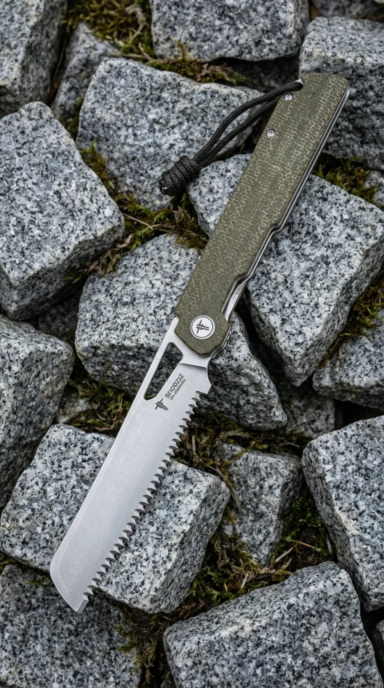 Shooziz XUN119D — нож, которому сложно придумать однозначную нишу. Но смотришь на серрейтор — и вопросы отпадают: такой зуб пилит кость, строп или толстую синтетику без лишних разговоров. Фронтфлиппер плюс отверстие в клинке — открывается по-разному, механика приятная и чёткая.