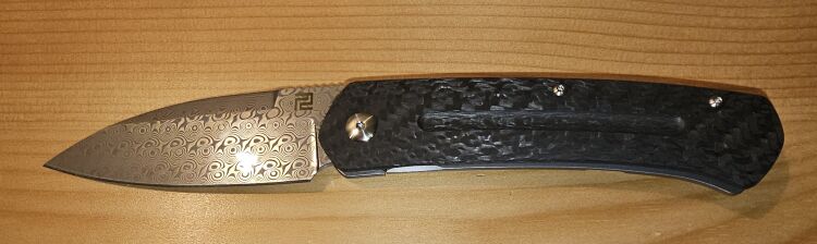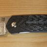 Рукоять изготовлена из титана с использованием накладки из карбона. Карбон это довольно дорогой, но невероятно прочный материал. Он очень легок и не боится влияния химических реагентов. Переплетения карбоновых нитей, вырисовывают уникальную текстуру, поэтому карбон прочно обосновался в сегменте аксессуарных и джентльменских ножей. Стоит отметить, что несмотря на то, что карбоновые нити почти не возможно порвать, этот материал плохо переносит удары, а так же прямое воздействие солнечных лучей.