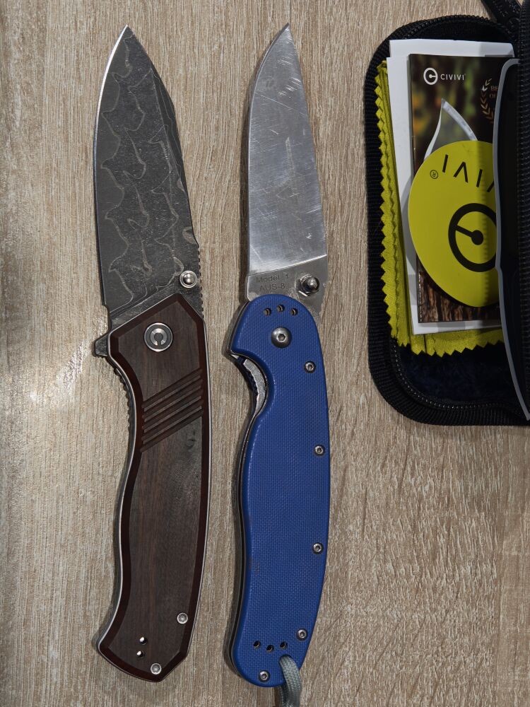 В общем - прикольный дамаск, аккуратная клипса и невысокая цена против раздражающе тонкой некрасивой рукояти и неприятных звуков.
