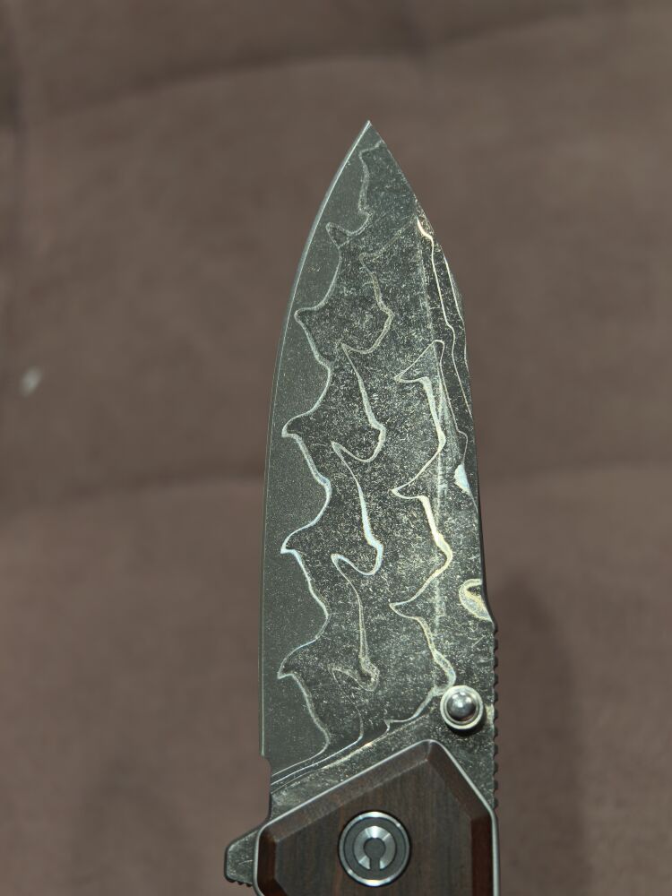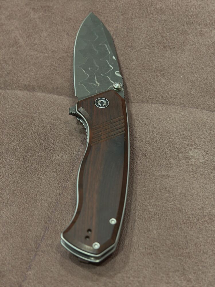 Клинок выполнен в форме clip point из дамасской стали, которая получается методом кузнечной ковки из пакета, состоящего из металла разного сорта. Благодаря наличию этих слоев, нож из дамасской стали имеет на поверхности характерный рисунок. Главное достоинство дамаска — сочетание твердости и гибкости, которая получается как раз из-за «смешивания» разносортного металла. Нож оснащён двумя способами открытия: флиппером и шпеньком. Это позволяет пользователю выбрать наиболее удобный для него метод: быстрое открывание одной рукой или более традиционное. Такой гибридный подход делает нож поистине универсальным. За надежную фиксацию клинка отвечает замок liner-lock, который гарантирует безопасность при использовании.
