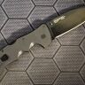 Клинок выполнен в форме spear-point, усиленный ребром жесткости, что обеспечивает устойчивость к боковым нагрузкам. Эта форма отлично подходит для уколов и проникающих ударов. Клинок изготовлен из стали S35VN, что гарантирует превосходные эксплуатационные качества. Эта сталь известна своей высокой ударной вязкостью, устойчивостью к коррозии и способности долго удерживать остроту. Клинок обработан методом DLC (Diamond-Like Coating), что придает ему прочное углеродное покрытие. Это покрытие обладает антрацитовым цветом, высокой твердостью, устойчивостью к коррозии и приятной на ощупь поверхностью. Нож оснащён двухсторонним шпеньком для удобного и быстрого открытия одной рукой, что делает его незаменимым в условиях, требующих оперативных действий. Замок ножа, Tri-ad lock, считается одним из самых надежных замков в мире. Он надежно фиксирует клинок, исключая какие-либо люфты.