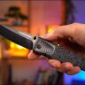 Рукоять выполнена из карбона — высокотехнологичного материала, обеспечивающего оптимальное сочетание прочности, легкости и эстетики. Эргономичная форма рукояти с относительно тонким профилем усиливает скрытные качества ножа и обеспечивает комфортный захват при длительном использовании. Матово-черный цвет рукояти идеально дополняет общую стилистику ножа. Для удобства ношения нож оснащен интегрированной клипсой, которая обеспечивает надежное крепление к карману и быстрое извлечение. Насечки на обухе клинка обеспечивают дополнительный упор большого пальца при выполнении точных работ.