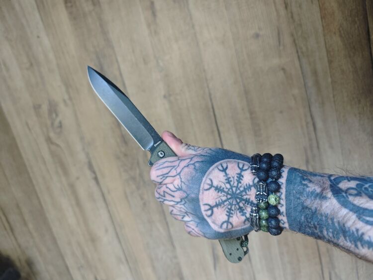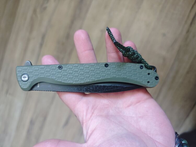 Нож оснащен клинком в форме Drop Point, что придаёт ему универсальность и позволяет эффективно справляться как с режущими, так и колющими задачами. Покрытие blackwash не только подчеркивает его агрессивный внешний вид, но и скрывает мелкие царапины, возникающие при повседневном использовании. Материал клинка — сталь 8Cr14MoV, которая обладает хорошей коррозионной стойкостью и твёрдостью, обеспечивая долговечность и износостойкость при регулярной эксплуатации. Эта сталь легко поддается заточке, что делает нож удобным в уходе. Для быстрого и удобного открывания нож оснащен флиппером, что позволяет легко привести клинок в рабочее положение. Надежный замок liner-lock обеспечивает безопасную фиксацию клинка в открытом положении, предотвращая случайное закрытие во время работы.
