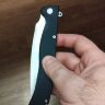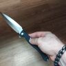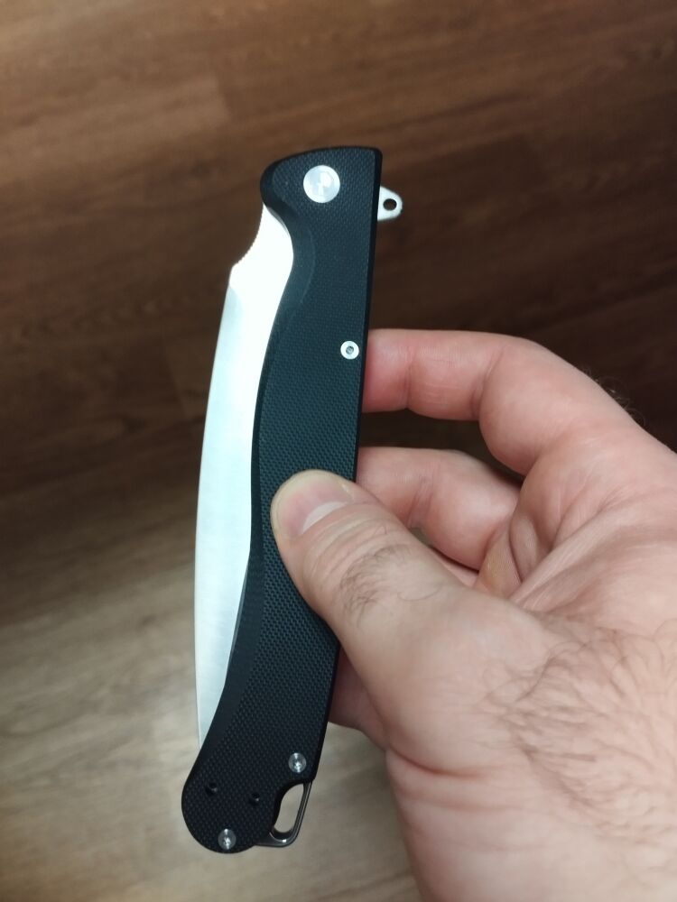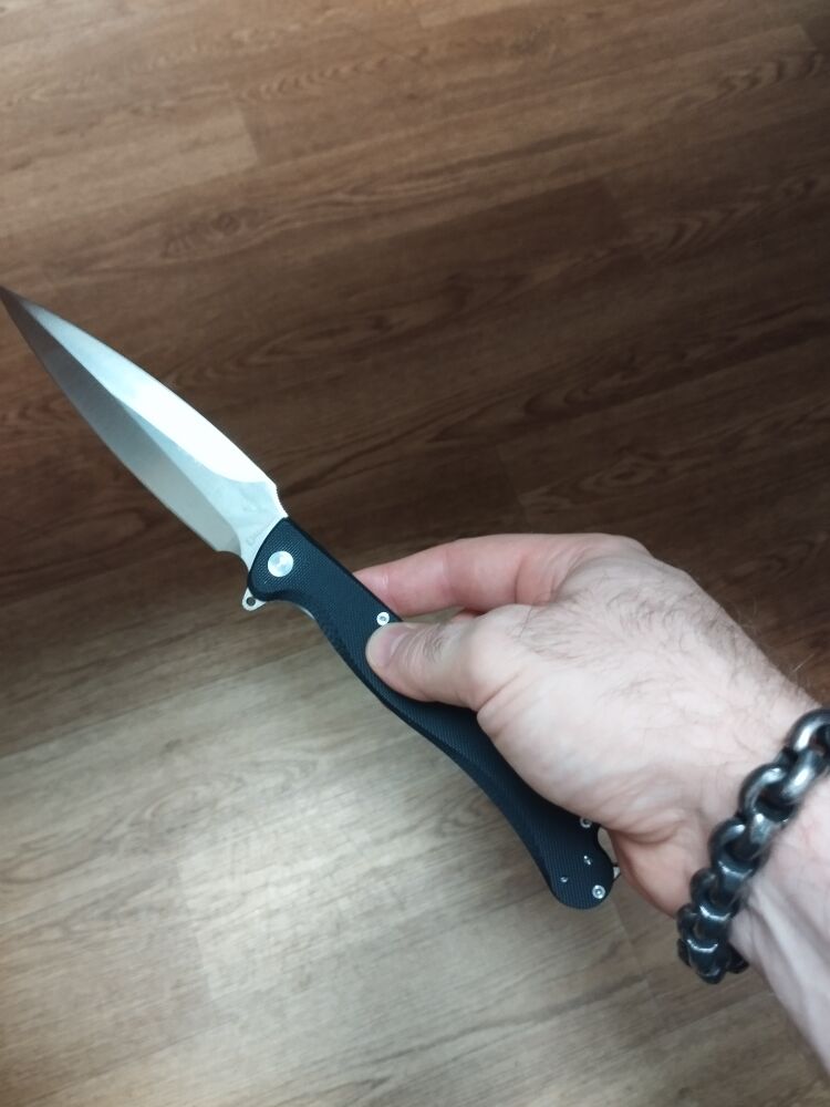 Огромный складень, моё уважение количеству металла на рукоятки. Клинок огромный для самых смелых хозяйственных работ. Механика практически не ощущается. Флипует как из пушки, доступно инерционное открывание. Лайнер мягкий, максимально комфортный.