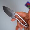Рукоять выполнена по скелетонизированной схеме — полностью из той же стали Niolox без традиционных накладок, что обеспечивает минимальный вес при сохранении высокой прочности. Продуманные вырезы в рукояти не только снижают общий вес ножа до комфортных 60 граммов, но и позволяют при необходимости обмотать рукоять паракордом для улучшения хвата в перчатках или холодных условиях. Эргономичная форма с плавными контурами гарантирует надёжный хват и комфорт при работе, а аккуратно обработанные грани делают нож приятным в руке даже при продолжительном использовании. Для удобства ношения нож поставляется с высококачественными ножнами из Kydex, которые позволяют носить его как шейный нож или закрепить на снаряжении. Также предусмотрено темлячное отверстие для крепления страховочного шнура или дополнительных аксессуаров.
