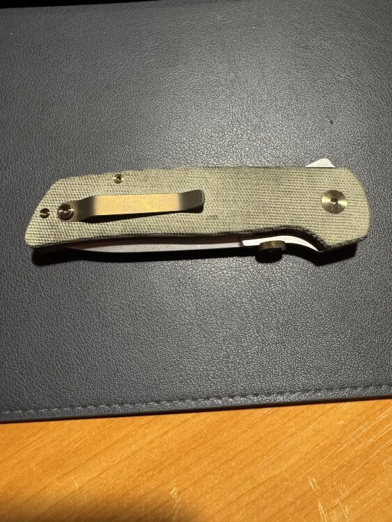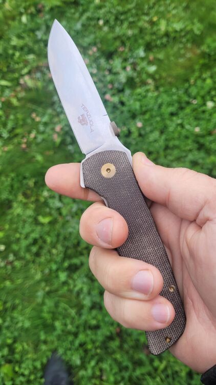 Рукоять выполнена из зелёной микарты — приятный на ощупь, надёжный композитный материал на основе ткани и смолы. Микарта даёт отличный хват даже во влажной среде, а со временем приобретает благородную патину, становясь только красивее. Эргономичная форма рукояти и обеспечивают надежный и комфортный хват, что особенно важно при работе в сложных условиях или в экстремальных ситуациях. В конструкции предусмотрена титановая клипса, позволяющая удобно носить нож с собой, закрепляя его на кармане или ремне для быстрого доступа.