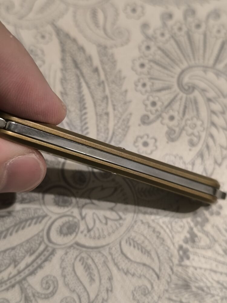 Рукоять ножа Vulpis изготовлена из прочного и легкого материала латуни, обеспечивающего удобный и надежный хват. Форма рукояти эргономична, что позволяет использовать нож длительное время без усталости. В конструкции также предусмотрено темлячное отверстие, расположенное в удобном месте для крепления шнурка или декоративного элемента, что добавляет ножу дополнительную функциональность и индивидуальность.