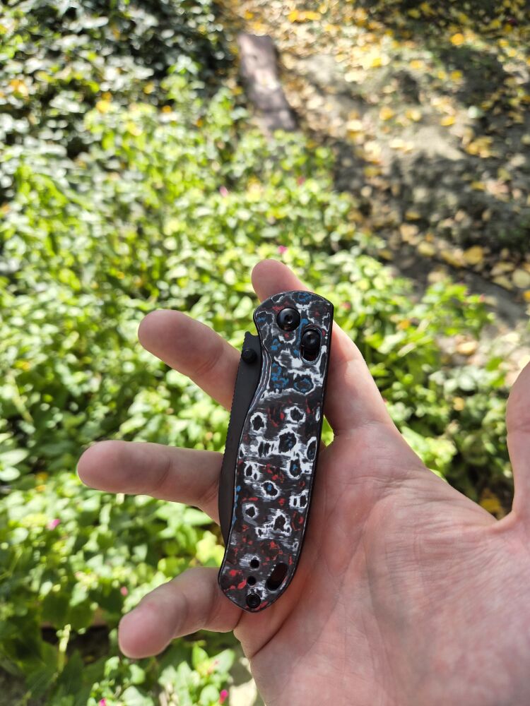 Материал рукояти ножа — FatCarbon® . Carbon fiber — углеволокно применяемое в различных сферах промышленности, в том числе и при создании рукоятей для ножей. Карбон это довольно дорогой, но невероятно прочный материал. Он очень легок и не боится влияния химических реагентов. Переплетения карбоновых нитей, вырисовывают уникальную текстуру, поэтому карбон прочно обосновался в сегменте аксессуарных и джентльменских ножей. Стоит отметить, что несмотря на то, что карбоновые нити почти не возможно порвать, этот материал плохо переносит удары, а так же прямое воздействие солнечных лучей.