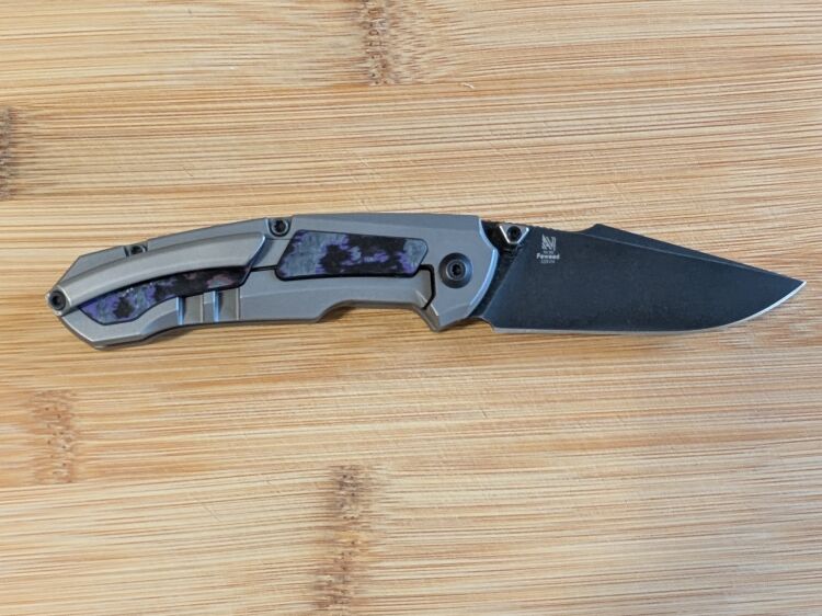 Рукоять ножа изготовлена из титана, что делает ее легкой и прочной. Она украшена вставками из FatCarbon, которые добавляют элегантности и подчеркивают премиальный характер ножа. Эргономичная форма рукояти обеспечивает удобство при длительном использовании. Наличие карманной клипсы позволяет удобно носить нож в кармане, всегда держа его под рукой.