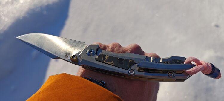 Рукоять ножа изготовлена из титана, что делает ее легкой и прочной. Она украшена вставками из карбона, которые добавляют элегантности и подчеркивают премиальный характер ножа. Эргономичная форма рукояти обеспечивает удобство при длительном использовании, а надежный хват предотвращает выскальзывание. Наличие карманной клипсы позволяет удобно носить нож в кармане, всегда держа его под рукой.