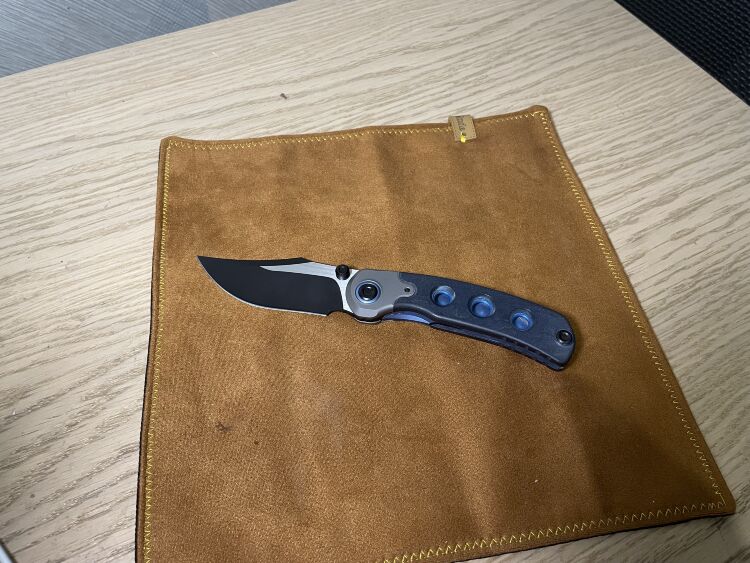 Рукоять выполнена из Richlite и титана. Титан - материал лёгкий, прочный, устойчив к механическим повреждениям и агрессивной среде. Благодаря хорошему балансу веса и длине нож ощущается монолитным, но не перегруженным. Форма рукояти эргономична, с плавными изгибами под пальцы, что обеспечивает комфорт при длительном использовании. В задней части установлена клипса tip-up для ношения в кармане — нож быстро достаётся и плотно фиксируется при переноске.