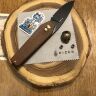 Рукоять выполнена из дерева мкурути – прочного и износостойкого материала с красивой текстурой. Геометрия рукояти вдохновлена формой гроба, что подчёркивает уникальный стиль ножа. Эргономика обеспечивает удобный хват, а благодаря натуральному дереву нож приятно ложится в руку. Карманная клипса позволяет удобно носить нож и всегда держать его под рукой.