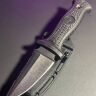 Клинок имеет форму drop-point — универсальную и хорошо управляемую, с крепким остриём, подходящим для прокалывания и деликатной работы. AUS-8 — японская коррозионностойкая сталь среднего ценового сегмента, которую уважают за хороший баланс твёрдости, устойчивость к коррозии и лёгкость в правке. Из минусов — при агрессивной работе может требовать более частой заточки, чем премиальные стали. Поверхность клинка полированная, без покрытия — это облегчает уход, а сам клинок легче очищать от загрязнений. Нож хорошо справляется с резом по дереву, продуктам и ткани. Серрейтор располагается почти по всей длине обуха.