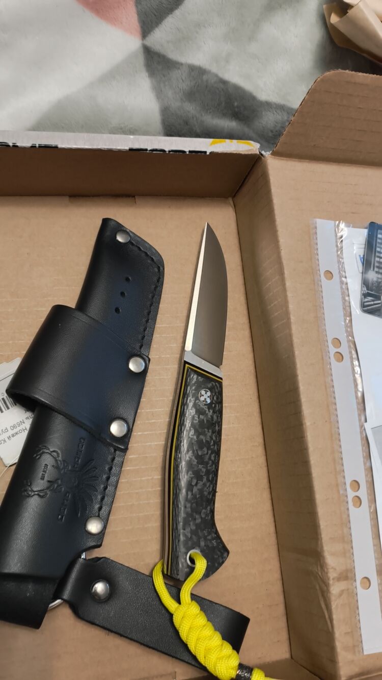 Теперь о ноже. Класный, небольшой нож финского типа. Сталь проверенная, с крио обработкой. В рабочих свойствах можно не совмневаться. Исполнение достойное. Рукоять-карбон. Очень удобный хват. Смотрится эффектно. Для кого-то может показаться скользковатой. В моем случае (брал на подарок), визуальный эффект важнее.🙂
