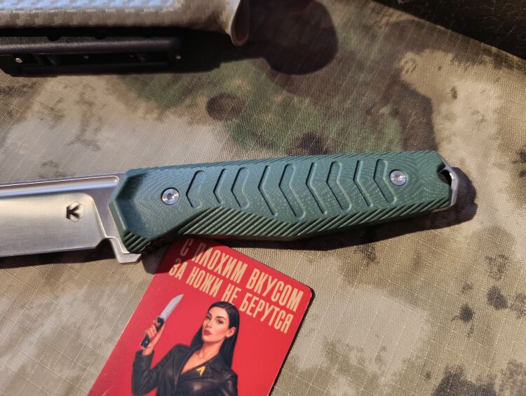 Рукоять выполнена из G10 — это прочный композит на основе стеклоткани и эпоксидной смолы, устойчивый к влаге, температурам и механическим повреждениям. Поверхность рукояти снабжена фрезерованными насечками, которые обеспечивают цепкий хват даже в мокрых руках. Форма рукояти эргономичная, с небольшим упором. В стальном хвостовике предусмотрено отверстие под темляк.