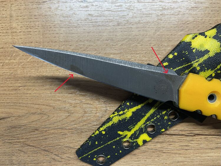 Есть вопрос к исполнению, на фото видно, что на клинке есть 2 пятна не понятного происхождения…что это такое может быть? Я сам им успел только открыть пару упаковок, мокрым не держал, ничего на него не капало, в принципе, если это никак не отразится на его качествах в будущем, то это не так важно, но если это, какой- то косяк термички, есть шанс, что в этом место сталь поведет себя не предсказуемо?