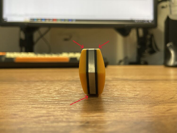 Далее на фото где нож на ребре и с тыльной стороны рукояти видно, что плашки на рукояти разной толщины и ширины, рукоять не ровная, как поперек, так и вдоль, к столу не прилегает. Я было предположил, что вдоль рукоять сделана бочкообразной формы для удобства, а остальное это элемент дизайна, но честно не понимаю какой в этом смысл, так что врятли…