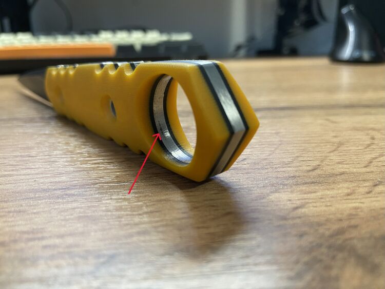 На стальной части рукояти везде где работала фреза, видны черные следы, фаски на микарте в отверстиях на рукояти и углублениях на ребрах почему – то не сняты, только в большом отверстии их как будто бы хотели снять, но как-то не уверенно, не ровно и скорее для галочки…
