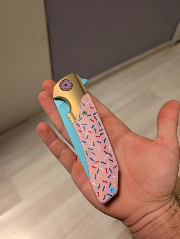 Рукоять изготовлена из титана с вставками из G10, что делает нож легким, прочным и эстетически привлекательным. Титан обладает превосходными механическими свойствами: он жаропрочен, устойчив к окислению и физически инертен, что гарантирует долгий срок службы ножа. Накладки на рукояти стилизованы под классический пончик с цветной посыпкой. Нож оснащен клипсой, что позволяет удобно и безопасно носить его в кармане или на ремне.