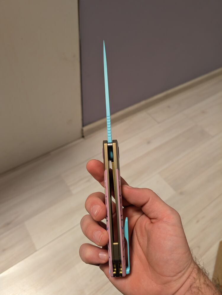 Из того, что отметил бы: «шипение» при открывании - говорят, фирменное, из-за керамических подшипников (как по мне, ну такое); покрытие клинка - достаточно нежное, кусочек сколол об кольцо случайно ( все же конкретно эта версия больше коллекционная, чем рабочая). В остальном же - один из лучших ножей.
