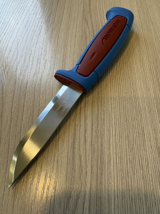 Рукоять выполнена из полипропилена — легкого, прочного и химически стойкого синтетического материала с двухкомпонентной конструкцией, который не боится воды, масел и экстремальных температур. Эргономичная бочкообразная форма с увеличенной геометрией гарантирует надежный хват и комфорт при длительном использовании. Рельефная поверхность обеспечивает уверенное удержание даже во влажных условиях или в перчатках. Выраженная защитная гарда для пальцев оптимизирована для максимальной безопасности при интенсивных работах с ударными нагрузками. Яркая цветовая комбинация делает нож отлично заметным в условиях плохой освещенности. Ножны изготовлены из ударопрочного полипропилена синего цвета и оснащены инновационной системой Morakniv Smart Button System, которая позволяет соединять несколько ножей Morakniv вместе для удобной организации инструментов. Практичная клипса обеспечивает крепление на поясе в вертикальном или горизонтальном положении, держа нож всегда под рукой.