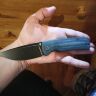 Рукоять ножа изготовлена из синей микарты, что придает конструкции прочность и легкость. Микарта — это композитный материал, состоящий из слоев ткани, пропитанных смолой и спрессованных под высоким давлением. Этот материал отличается высокой устойчивостью к механическим повреждениям и воздействию влаги, что обеспечивает надежный и комфортный хват. Эргономичная форма рукояти предотвращает скольжение даже в условиях повышенной влажности, обеспечивая уверенное управление ножом. Синий цвет микарты придает ножу уникальный и привлекательный внешний вид.