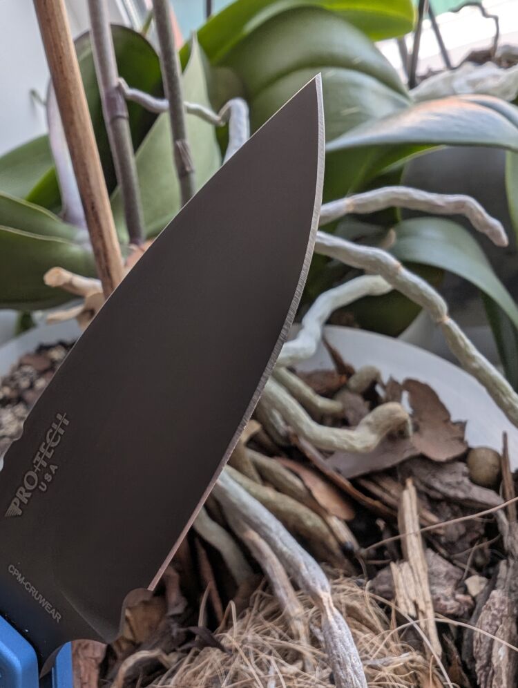Клинок ножа Pro-Tech/Strider PT+ выполнен из инструментальной стали Cruwear. Она известна такими свойствами, как прочность, износостойкость и удержание остроты режущей кромки. На поверхность клинка нанесено DLC покрытие чёрного цвета, обеспечивающее защиту от царапин. Клинок с формой drop-point обеспечивает превосходную универсальность и баланс, что подходит как для точных, так и для силовых задач. Автоматическая система открытия, активируемая нажатием на кнопку, делает этот нож особенно удобным и безопасным в использовании, мгновенно приводя его в готовность.