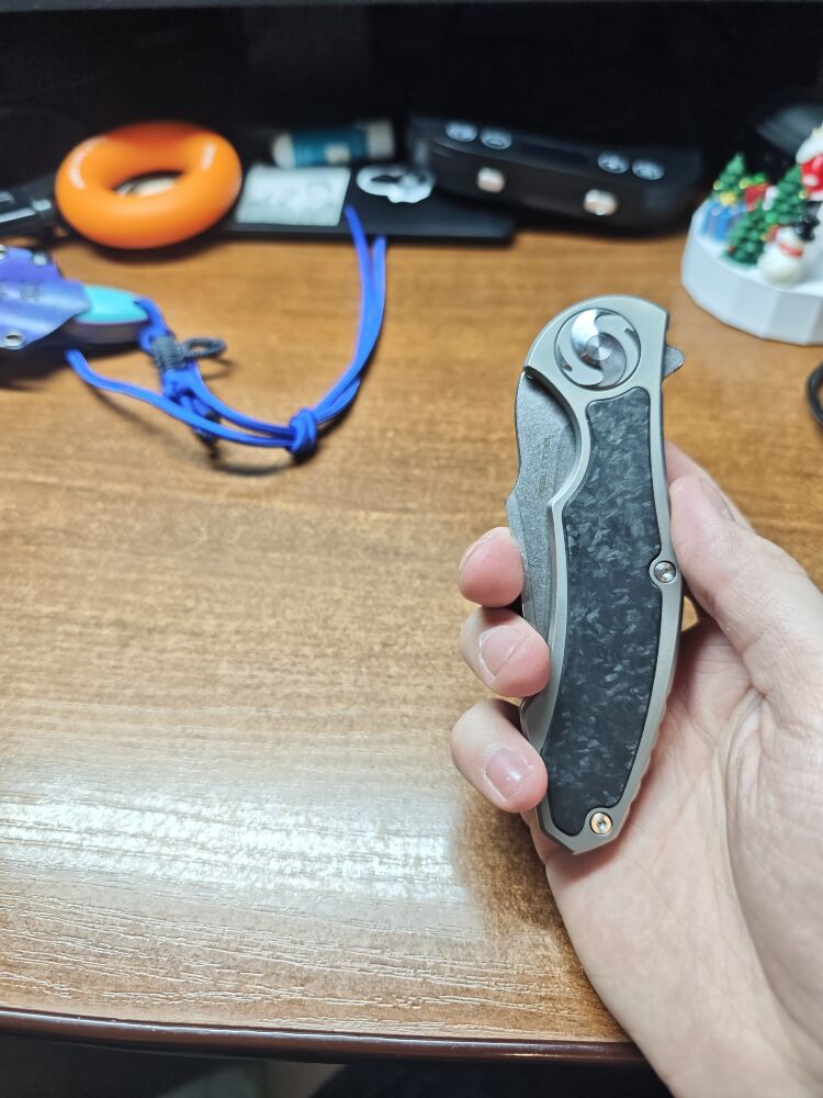 Рукоять сочетает титан и вставки из карбона. Титан обеспечивает легкость, прочность и стойкость к коррозии, а углеволокно добавляет премиальный внешний вид и улучшает сцепление. Такой дуэт материалов делает нож легким, сбалансированным и удобным в использовании. Эргономичная форма снижает усталость при продолжительном использовании, а сочетание материалов делает конструкцию легкой и сбалансированной.