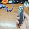 Рукоять сочетает титан и вставки из карбона. Титан обеспечивает легкость, прочность и стойкость к коррозии, а углеволокно добавляет премиальный внешний вид и улучшает сцепление. Такой дуэт материалов делает нож легким, сбалансированным и удобным в использовании. Эргономичная форма снижает усталость при продолжительном использовании, а сочетание материалов делает конструкцию легкой и сбалансированной.