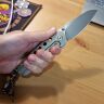 Клинок выполнен в форме spear point, что обеспечивает безопасный и контролируемый рез, идеально подходя для задач, где требуется точность без риска случайного прокола. Сталь Böhler M390, одна из лучших премиальных марок, отлично держит заточку, устойчива к коррозии и износу. Поверхность клинка обработана методом beadblast вручную, что придаёт поверхности мягкий шелковистый блеск и подчёркивает текстуру стали. Открытие осуществляется с помощью флиппера или шпенька, а фиксирует клинок надежный frame-lock — прочная и проверенная временем система фиксации, интегрированная прямо в титановую рукоять. В осевом узле — керамические подшипники, обеспечивающие плавный ход лезвия.