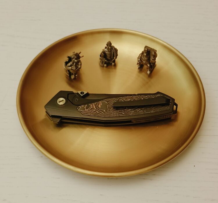 Рукоять выполнена из комбинации титана и карбона — это сочетание обеспечивает оптимальный баланс между прочностью, легкостью и эстетикой. Титан придаёт конструкции исключительную коррозионную стойкость и долговечность, а вставки из карбона добавляют современный высокотехнологичный вид и дополнительную жесткость. Эргономичная форма рукояти с продуманной геометрией гарантирует надежный хват и комфорт при длительном использовании. Все поверхности тщательно обработаны, что делает нож приятным в руке даже при продолжительной работе. Для удобства ношения нож оснащен титановой клипсой tip-up под правую руку, а также темлячным отверстием для крепления страховочного шнура или декоративного элемента.