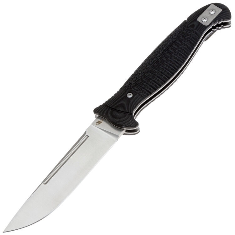 Рукоять изготовлена из G10, прочного и легкого композитного материала, который состоит из слоев стеклоткани, пропитанных эпоксидной смолой. G10 обеспечивает отличную устойчивость к механическим повреждениям, а также не боится влаги, что делает рукоять долговечной и удобной в использовании. Эргономичная форма рукояти с упором гарантирует комфортный и надежный хват. На рукояти также предусмотрена клипса, позволяющая удобно носить нож в кармане.