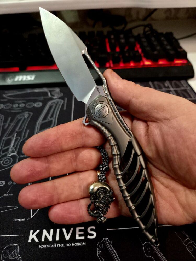 Рукоять выполнена из титана, что обеспечивает ножу лёгкость и прочность. За счёт сквозной фрезеровки, имитирующей рёбра, её вес значительно снижен, а внешний вид приобретает выразительную инопланетную эстетику. Удобная карманная клипса позволяет носить нож с комфортом и надёжной фиксацией в кармане или на снаряжении.