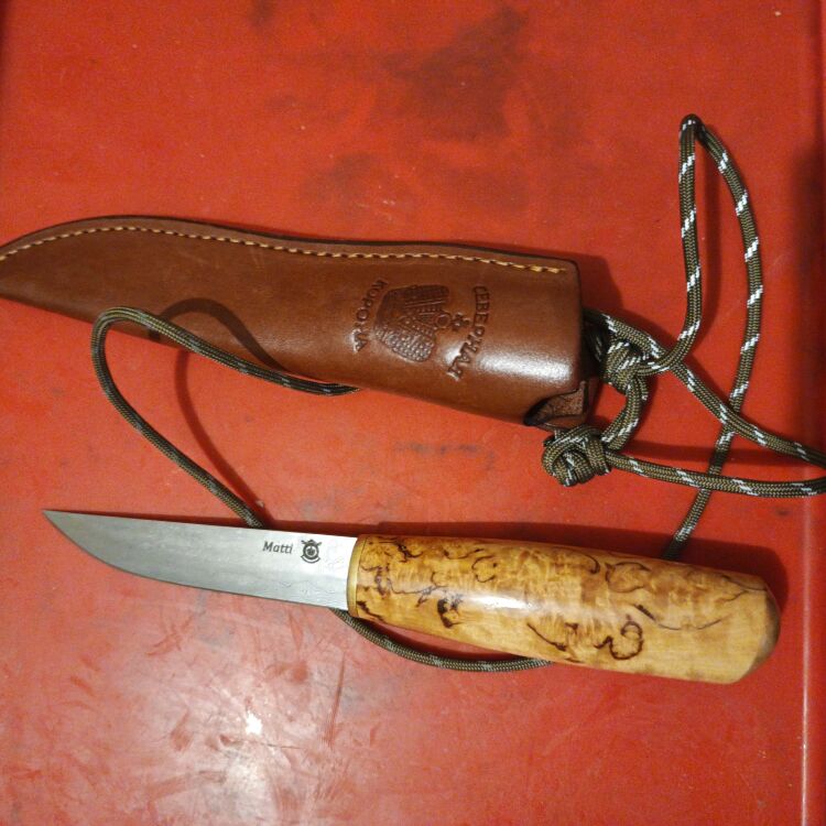 Нож Matti от компании Северная корона выполнен по скандинавским мотивам. Клинок сделан из высокоуглеродистой дамасской стали, он универсален и отлично подойдет для работы в лесу. Рукоять из карельской березы имеет утолщение в центральной части, благодаря чему будет хорошо лежать в руке.