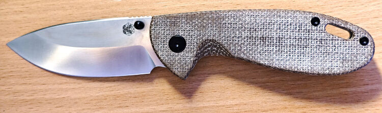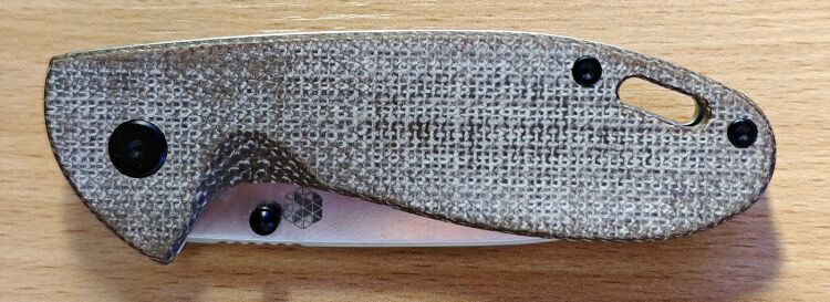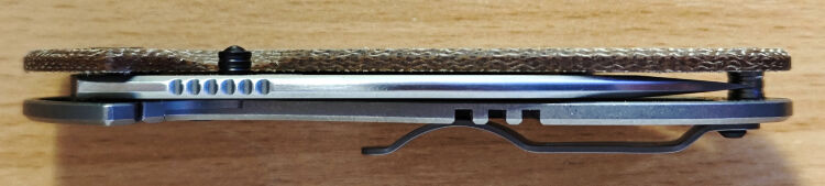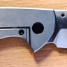 По минусам: клинок в закрытом положении чуть-чуть не по центру, пластина фрейма заподлицо с микартовой накладной и тугая, из-за этого приходится сильно вдавливать палец между половинками рукояти. Клипса прижимается к пропилам на фреймлоке, из-за чего садить и снимать нож на карман тяжело. На одном из торксов крепления клипсы частично сорваны шлицы