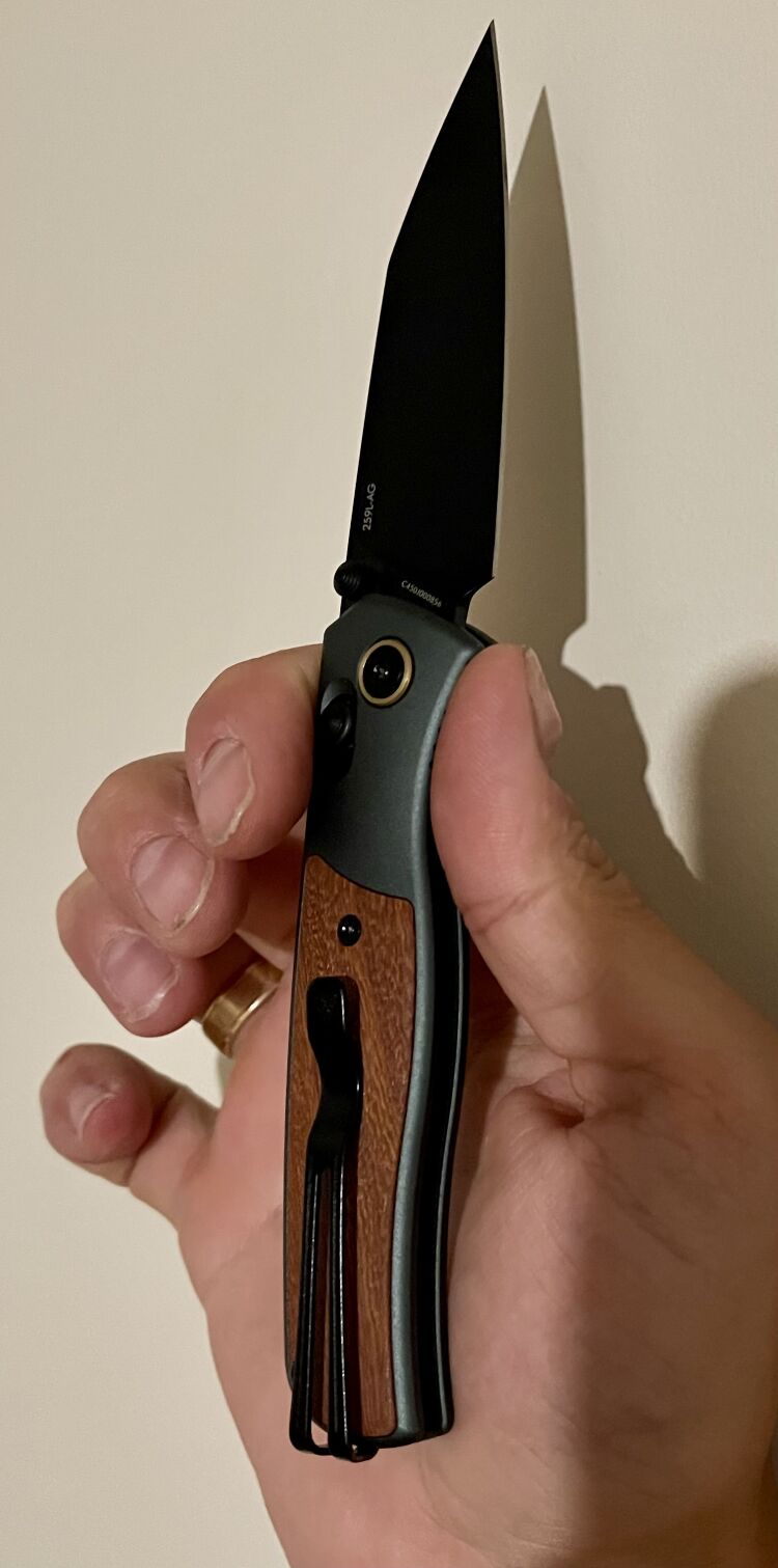 Рукоять изготовлена из лёгкого, прочного алюминия с изысканными вставками из палисандра — натурального дерева с красивой текстурой и тёплым оттенком. Алюминий придаёт корпусу лёгкость и прочность, а вставки rosewood создают ощущение тепла, стиля и приятной на ощупь поверхности. Такой дизайн — не только эстетичен, но и практичен: деревянные вставки приятны на ощупь, а металл — надёжен. Рукоять плавно ложится в руку, а наличие карманной клипсы позволяет удобно носить нож в кармане, сохраняя доступность и компактность.