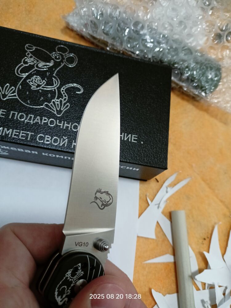 Клинок имеет универсальную форму drop-point, обеспечивающую баланс между прочностью и функциональностью. Выполнен из качественной японской стали VG-10, известной своей отличной стойкостью к коррозии и прочностью. Сатиновая обработка придаёт клинку утончённый вид и снижает вероятность появления бликов, что делает его особенно практичным. Раскрытие осуществляется при помощи удобного шпенька, а надёжную фиксацию обеспечивает liner-lock, предотвращающий случайное закрытие во время работы.